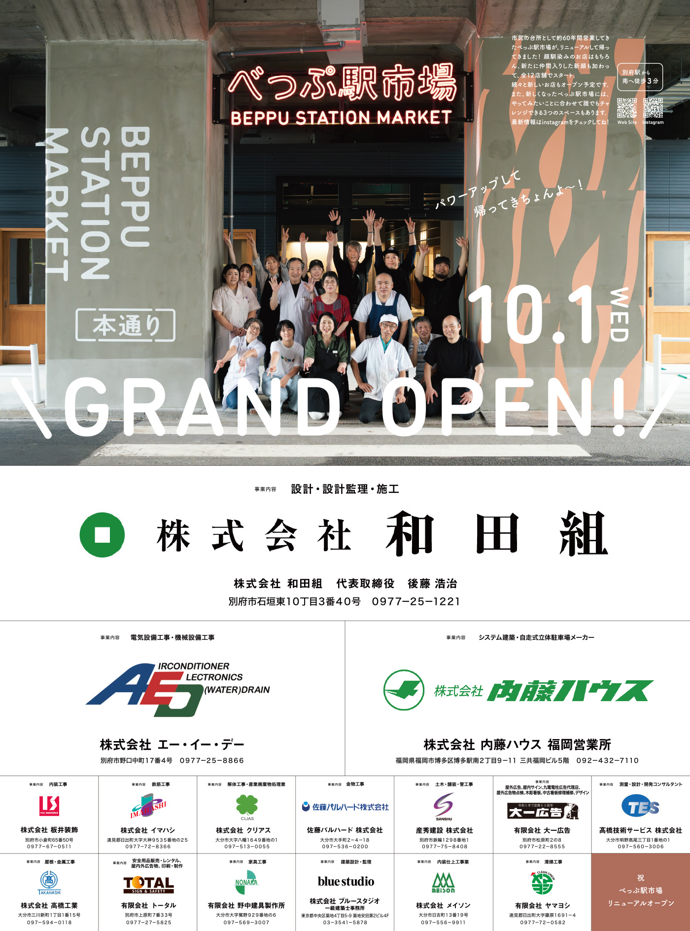 和田組は新しくなった別府市民の台所が皆さまに愛され、ますます賑わうことを願って、9月30日(火)の大分合同新聞朝刊の一面に広告を掲載させていただきました。「べっぷ駅市場」は引き続き2期工事を行い、2026年夏頃に完了予定です。全面開業にもご期待ください。